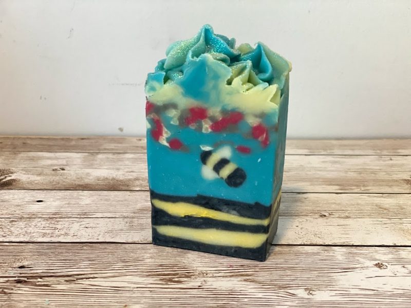 “Bees Knees” soap features rich butters & oils and a cute little bumble bee friend with a fresh blend of lemon, orange, & lavender essential oils