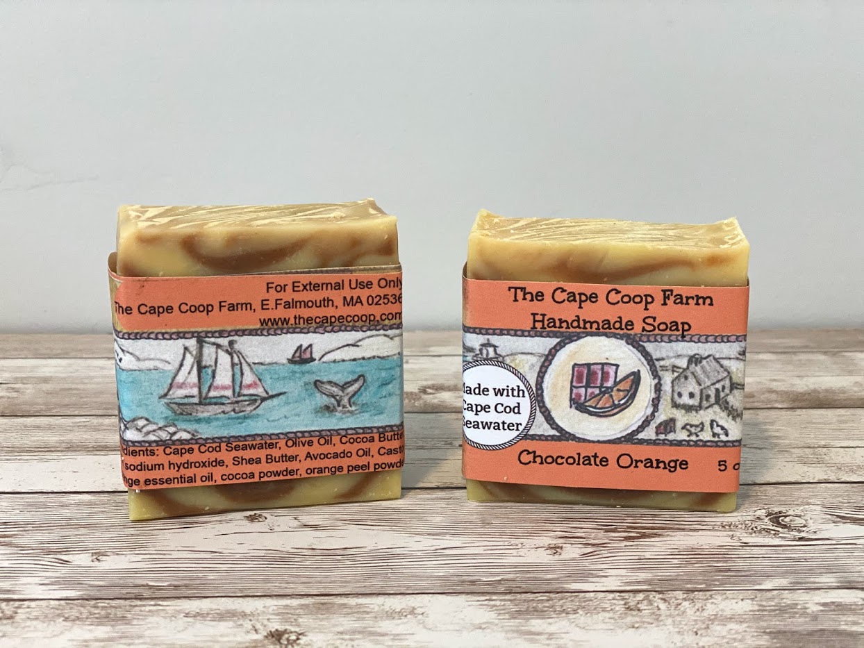 ingredients: Cape Cod Seawater, Olive Oil, Cocoa Butter, Coconut oil, sodium hydroxide, Shea Butter, Avocado Oil, Castor Oil, orange essential oil, cocoa powder, orange peel powder